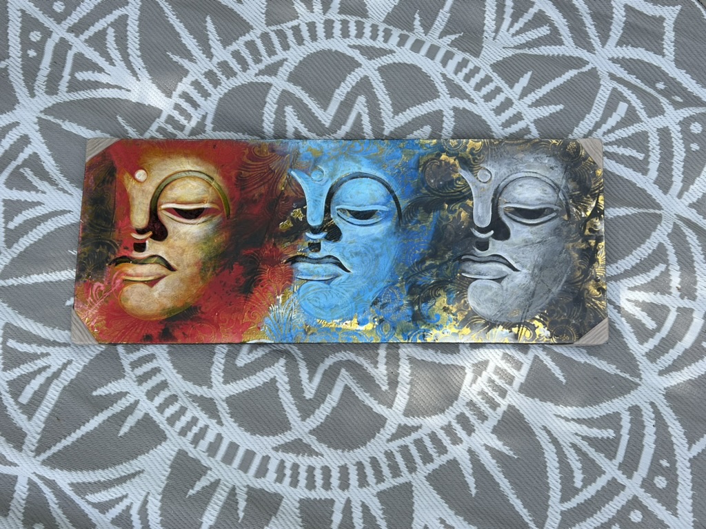 Apportez une touche zen et contemporaine à votre intérieur avec ce tableau panoramique représentant trois visages de Bouddha aux teintes harmonieuses.