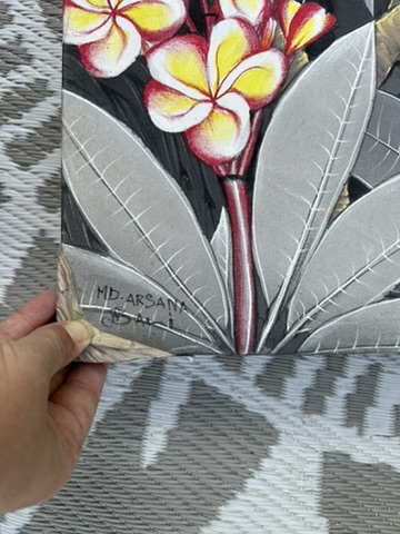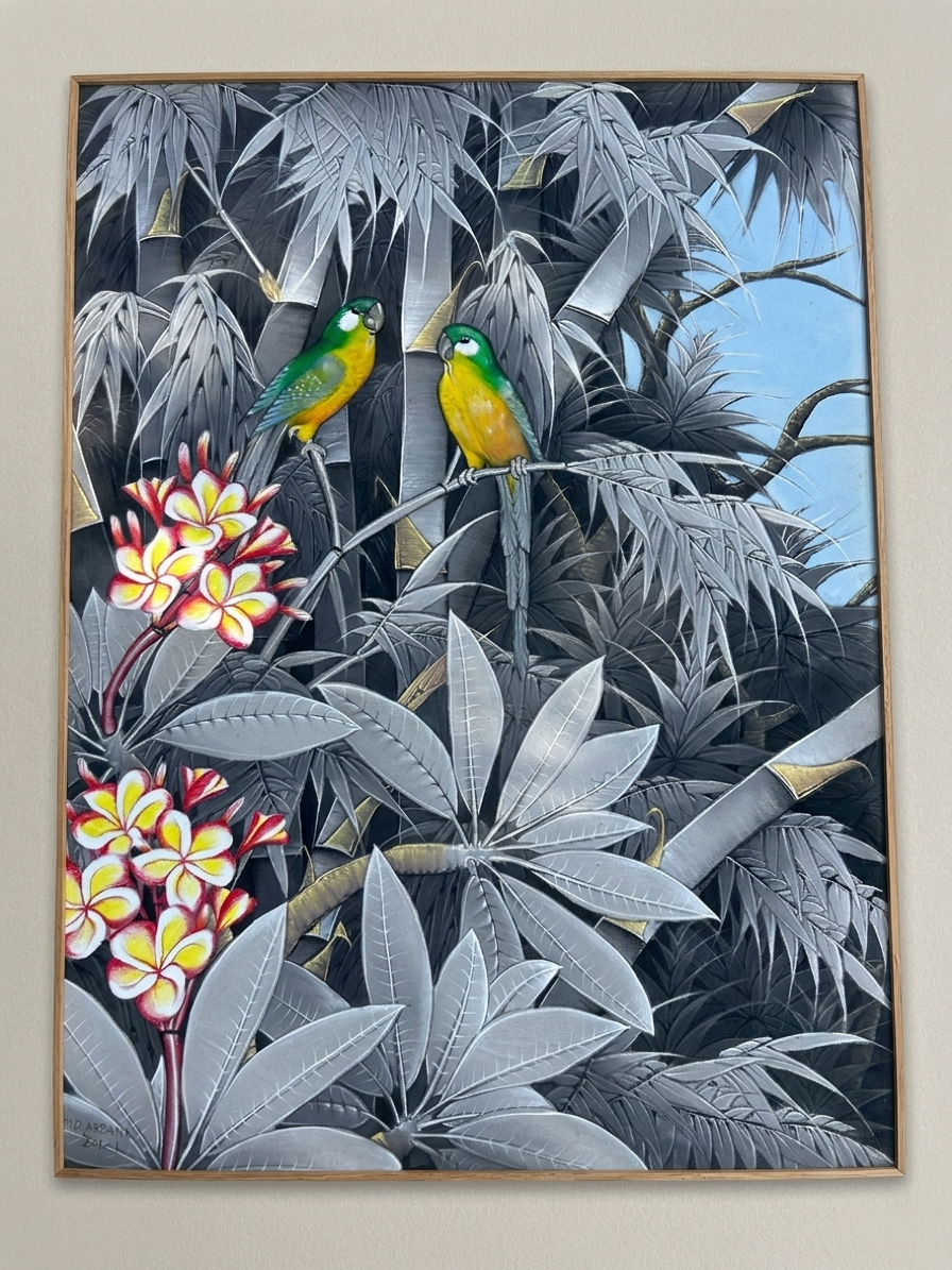 Réalisée en Indonésie, cette œuvre séduit par son contraste subtil entre un fond végétal aux nuances de gris et des touches de couleurs lumineuses apportées par les oiseaux et les fleurs.