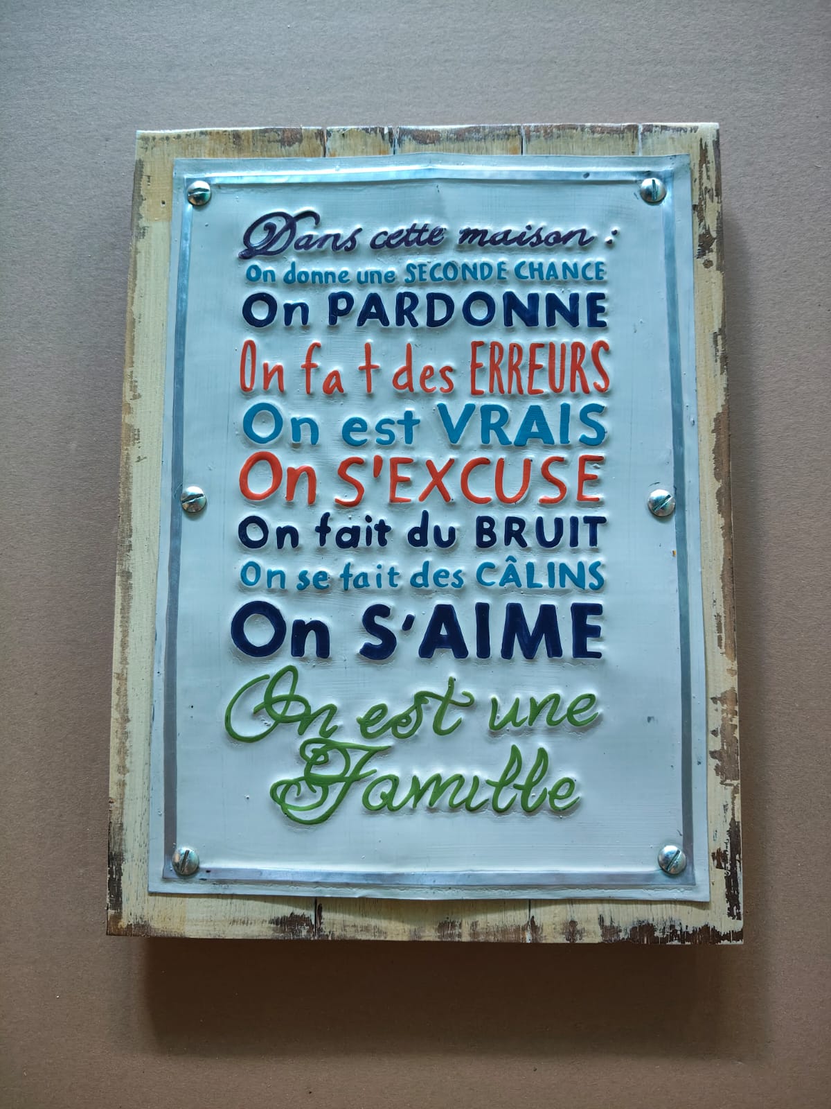 Célébrez l'esprit de tribu avec ce tableau mural en métal embossé de 40x30 cm. Véritable charte de bienveillance, il énumère les principes fondamentaux qui font d'un foyer un lieu unique : "Dans cette maison : On donne une seconde chance, on pardonne, on fait des erreurs, on est vrais, on s'excuse, on fait du bruit, on se fait des câlins, on s'aime. On est une famille".