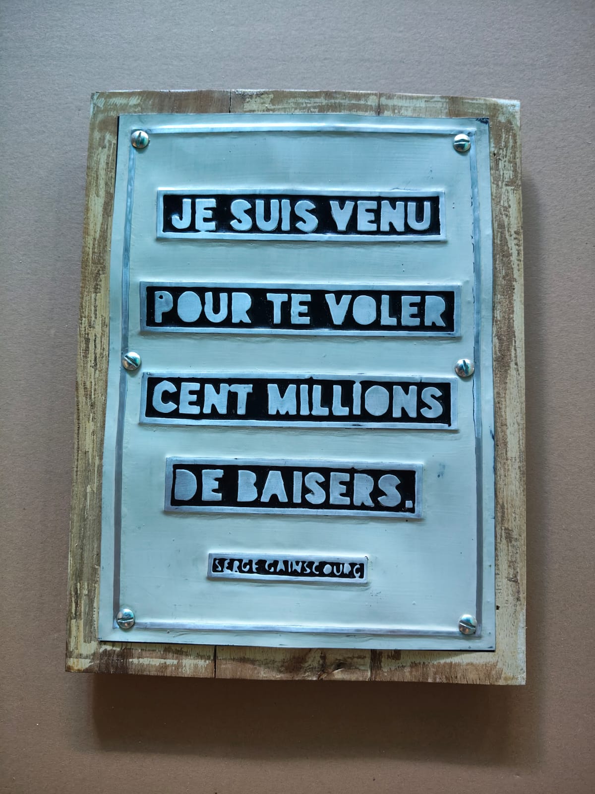 Déclarez votre flamme avec une touche de poésie rock grâce à ce tableau mural en métal embossé de 40x30 cm. Reprenant les célèbres paroles de Serge Gainsbourg : "Je suis venu pour te voler cent millions de baisers", cette pièce est un hommage élégant et vintage à l'iconique chanson de l'homme à la tête de chou.