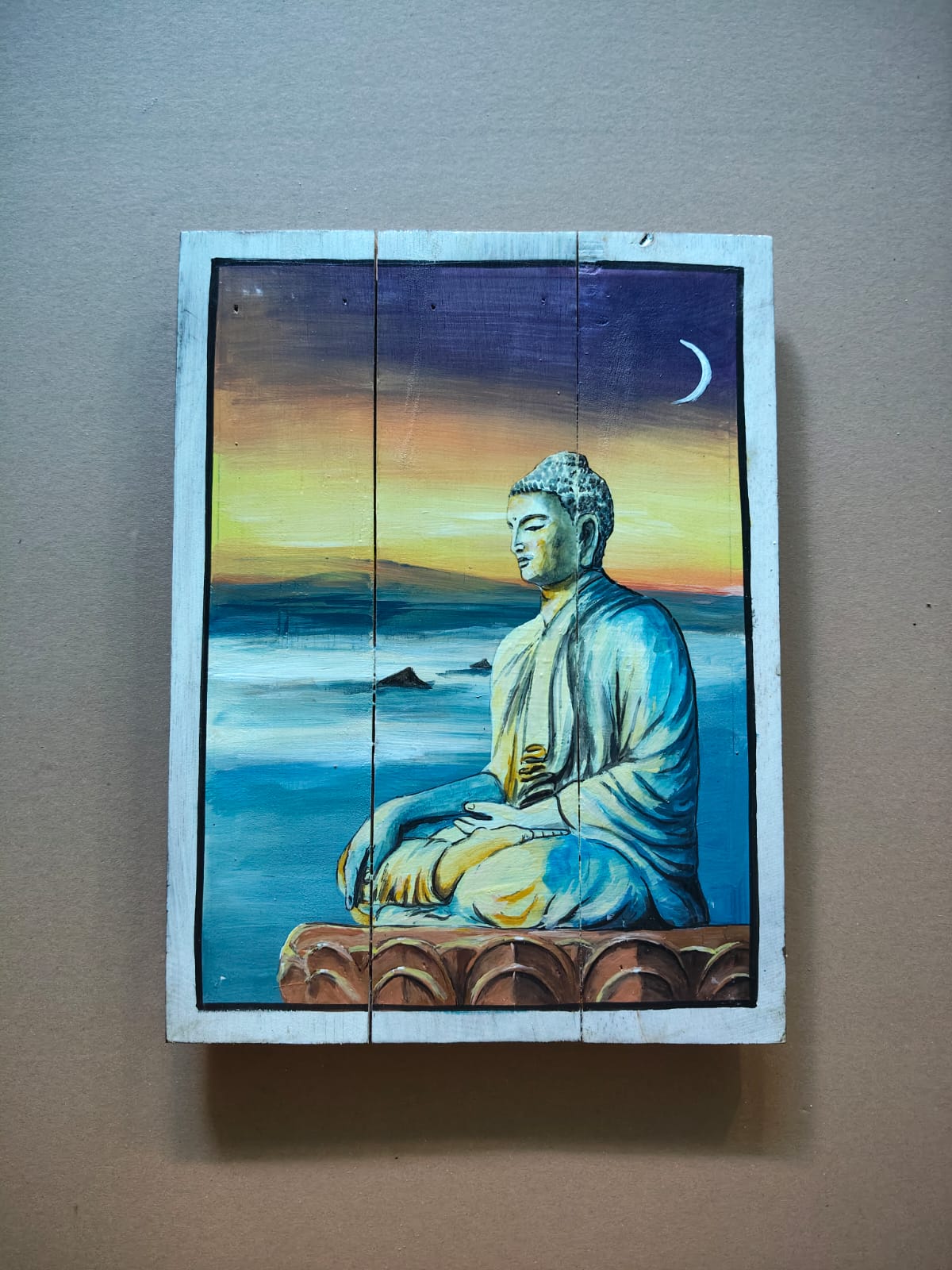 Plongez dans une atmosphère de quiétude absolue avec ce tableau sur bois véritable de 40x30 cm. Cette œuvre poétique représente Bouddha en méditation profonde sur un socle de lotus, face à une étendue d'eau paisible sous un fin croissant de lune.